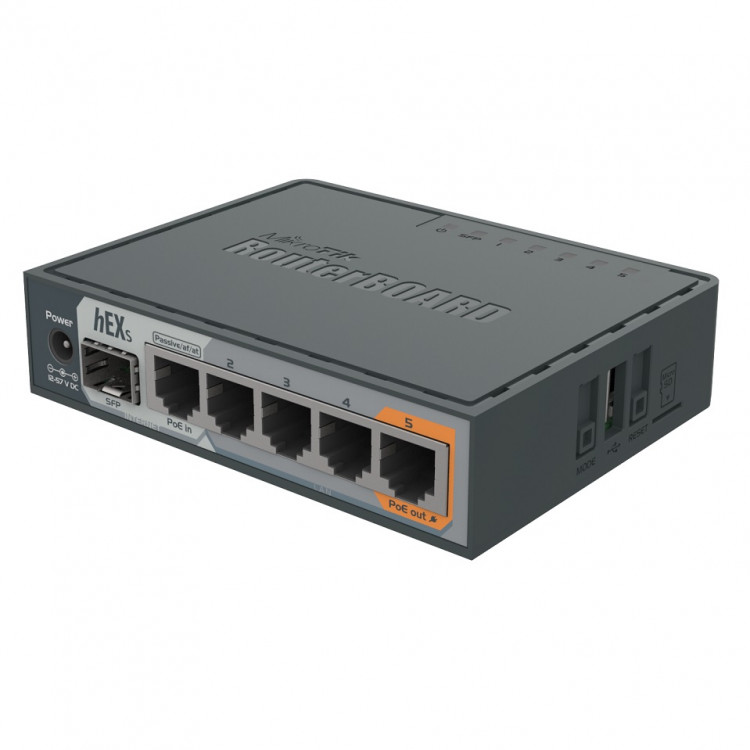 hEX S is a five port Gigabit Ethernet router for locations where wireless connectivity is not required. Compared to the hEX, the hEX S also features an SFP port and PoE output on the last port.